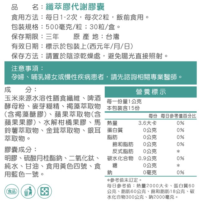 【歐瑪茉莉】纖萃膠代謝膠囊 30粒x1盒(沖繩褐藻醣膠+膳食纖維-順暢窈窕)