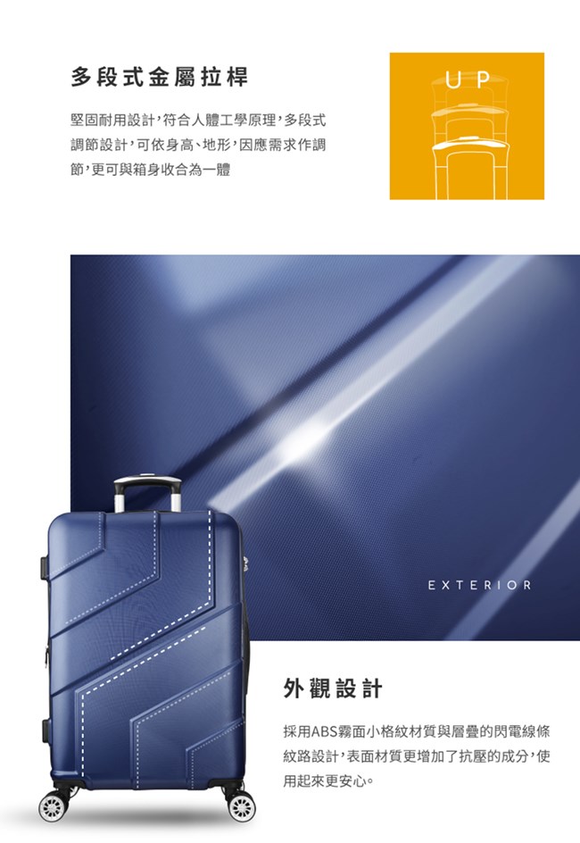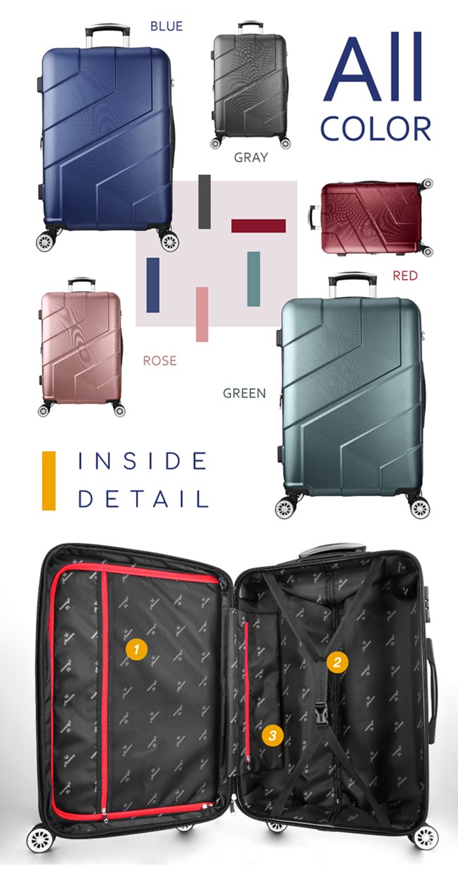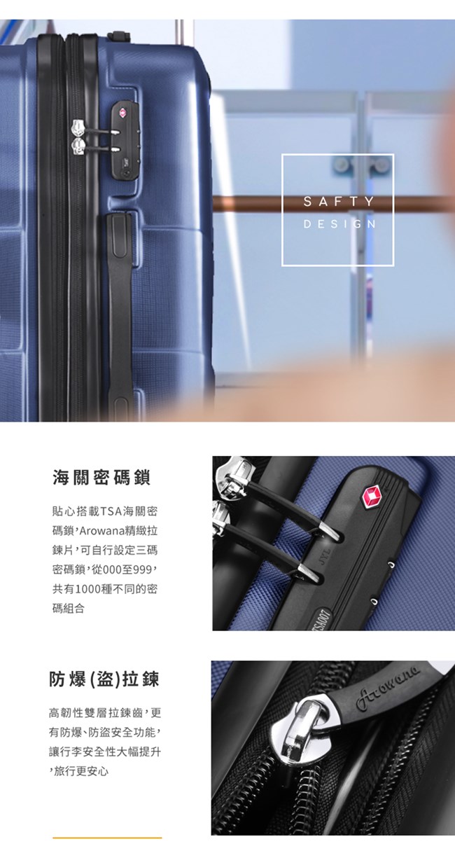 商品配件:TSA海關密碼鎖、靜音飛機輪、防爆/防盜拉鍊、可加大拉鍊層