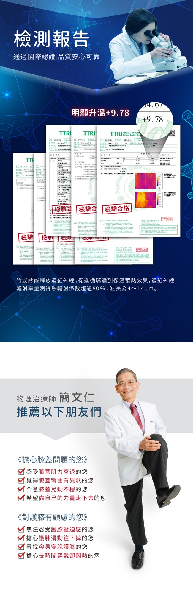 護膝:鍺全效機能紗16%、彈力紗11%、聚酯纖維(含竹炭)21%、尼龍52%