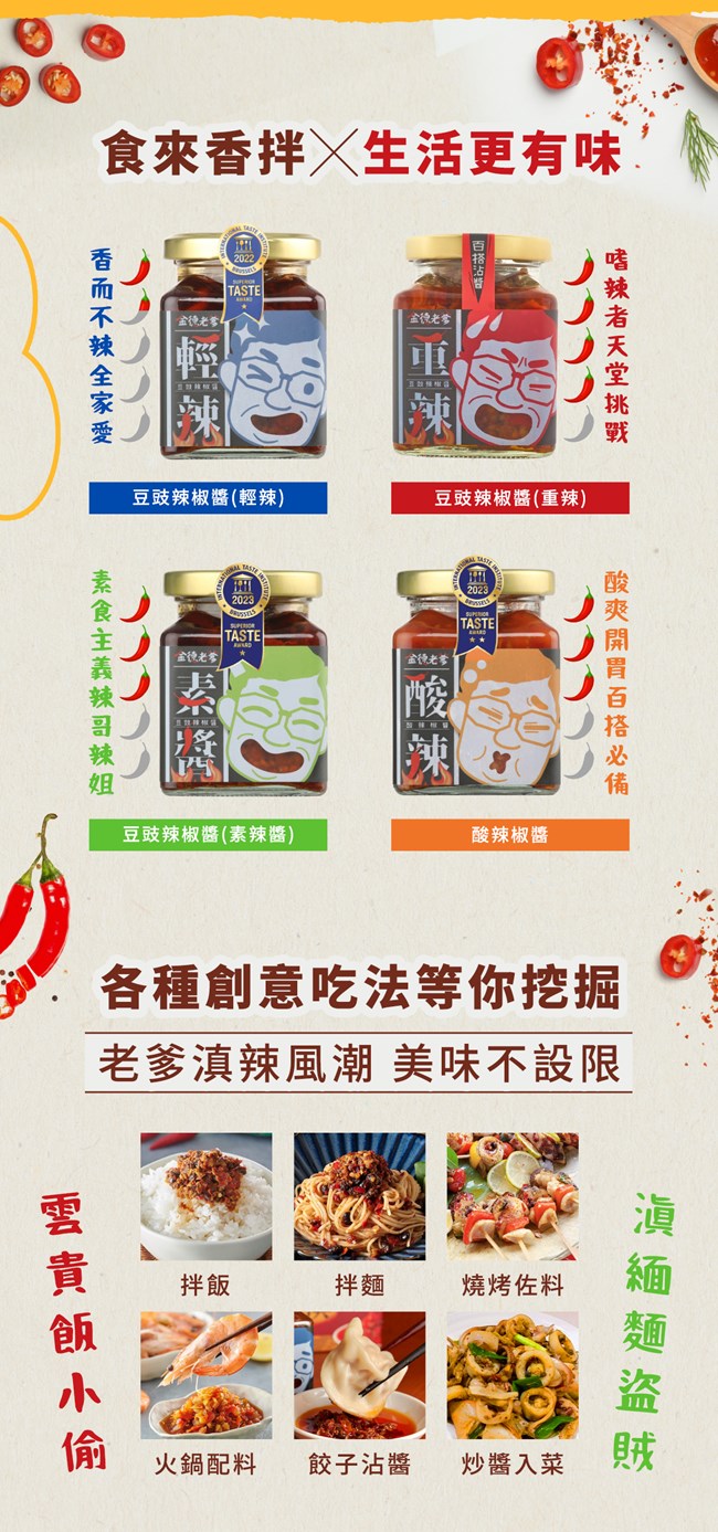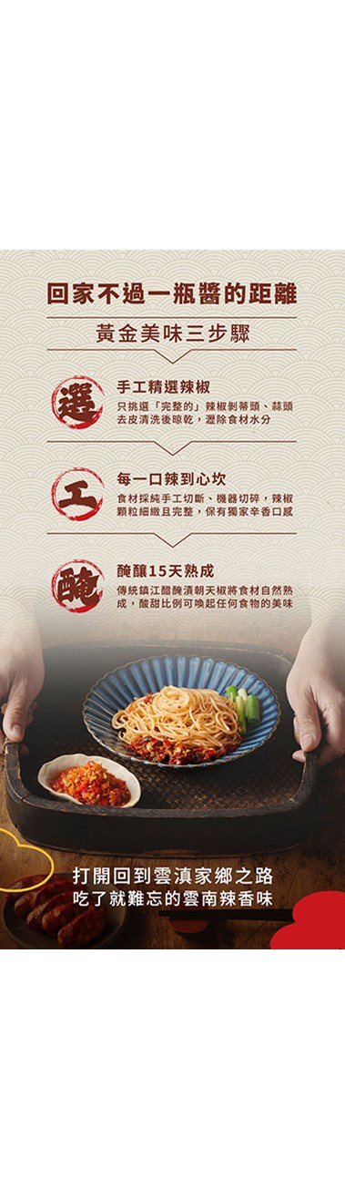 成份:朝天椒,紅辣椒,蒜頭,無麩質醬油,鎮江白醋,鹽,二砂糖