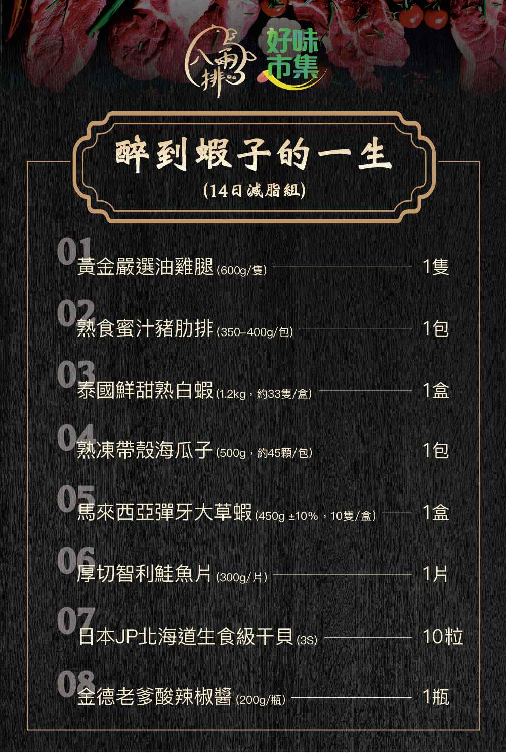 黃金嚴選油雞腿(600g/隻)*1隻、熟食蜜汁豬肋排(350~400g/包)*1包 、泰國鮮甜熟白蝦(1.2kg,約33隻/盒)*1盒、熟凍帶殼海瓜子(500g,約45顆/包)*1包、馬來西亞彈牙大草蝦(450g±10%,10隻/盒) *1盒、厚切智利鮭魚片(300g/片)*1片、日本JP北海道生食級干貝(3S)*10粒、金德老爹酸辣椒醬(200g/瓶)*1瓶
