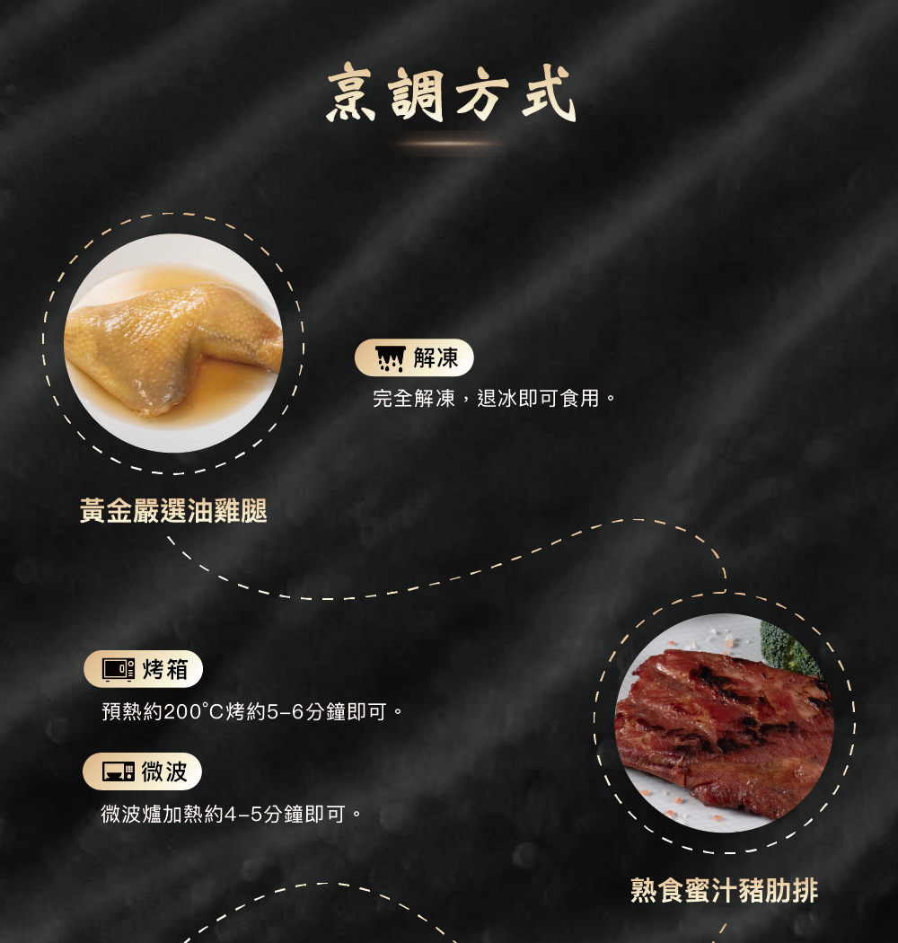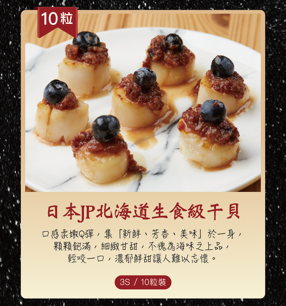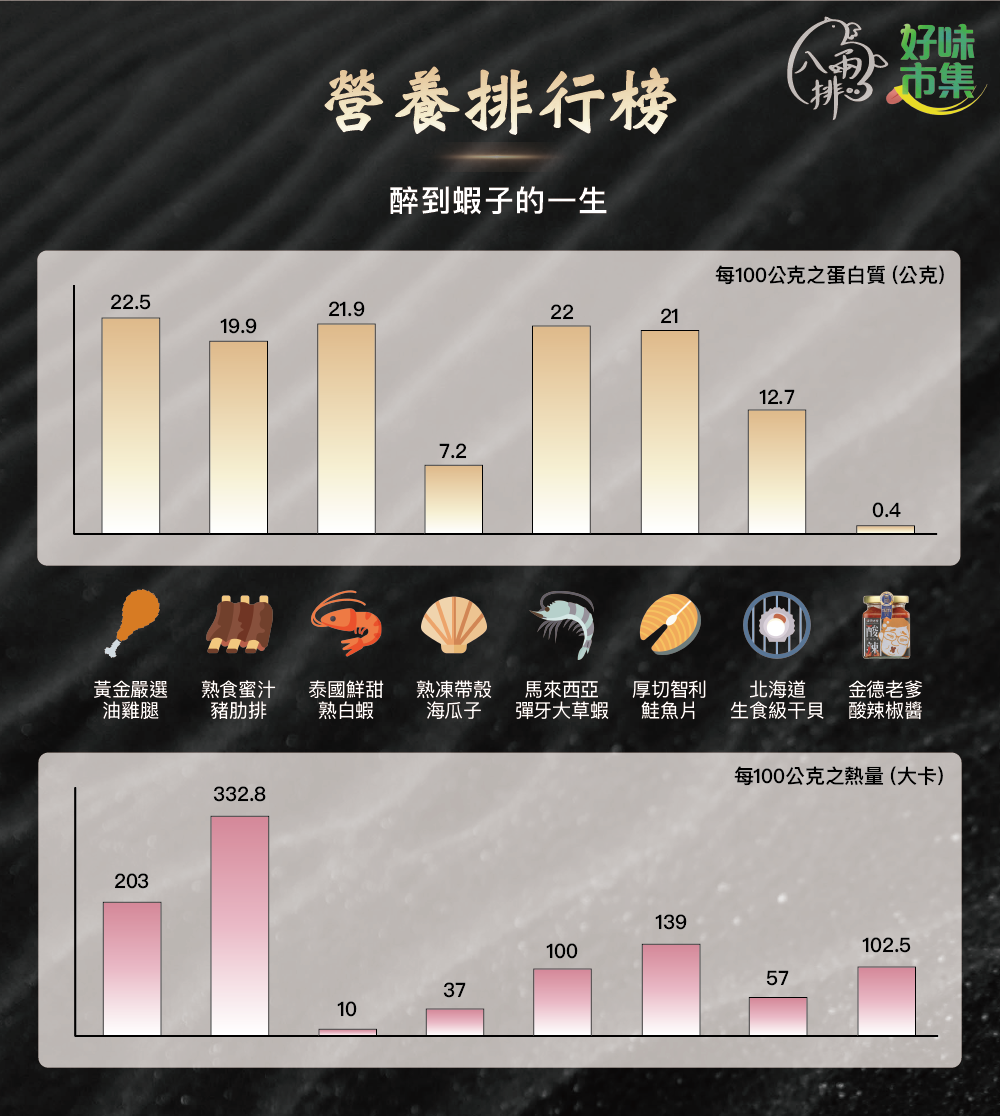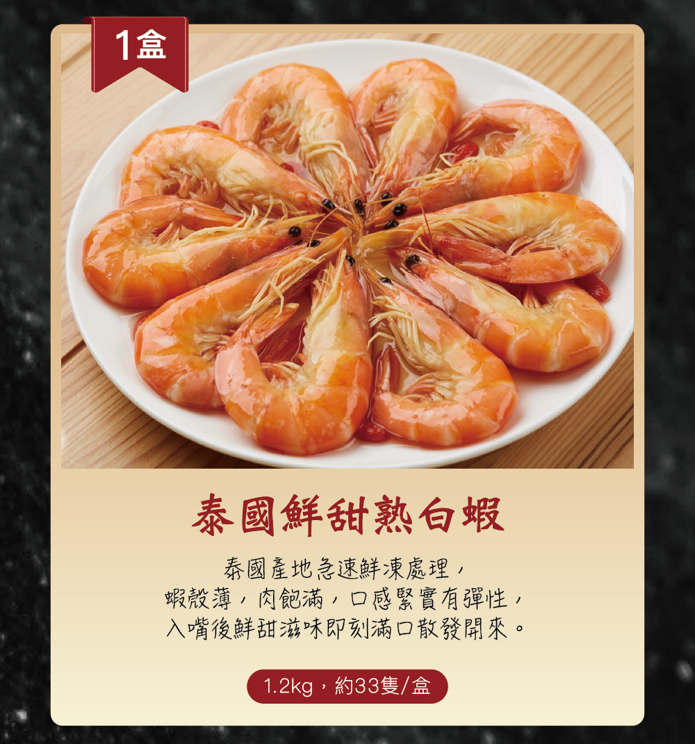 黃金嚴選油雞腿、 熟食蜜汁豬肋排、泰國鮮甜熟白蝦、熟凍帶殼海瓜子、馬來西亞彈牙大草蝦、厚切智利鮭魚片、日本JP北海道生食級干貝、金德老爹酸辣椒醬