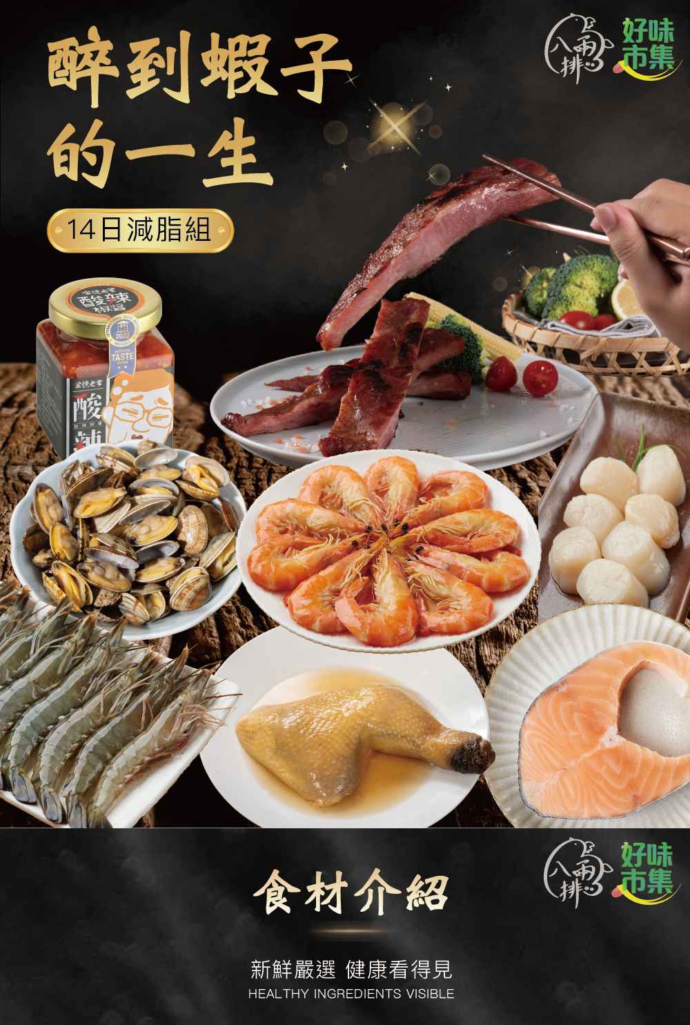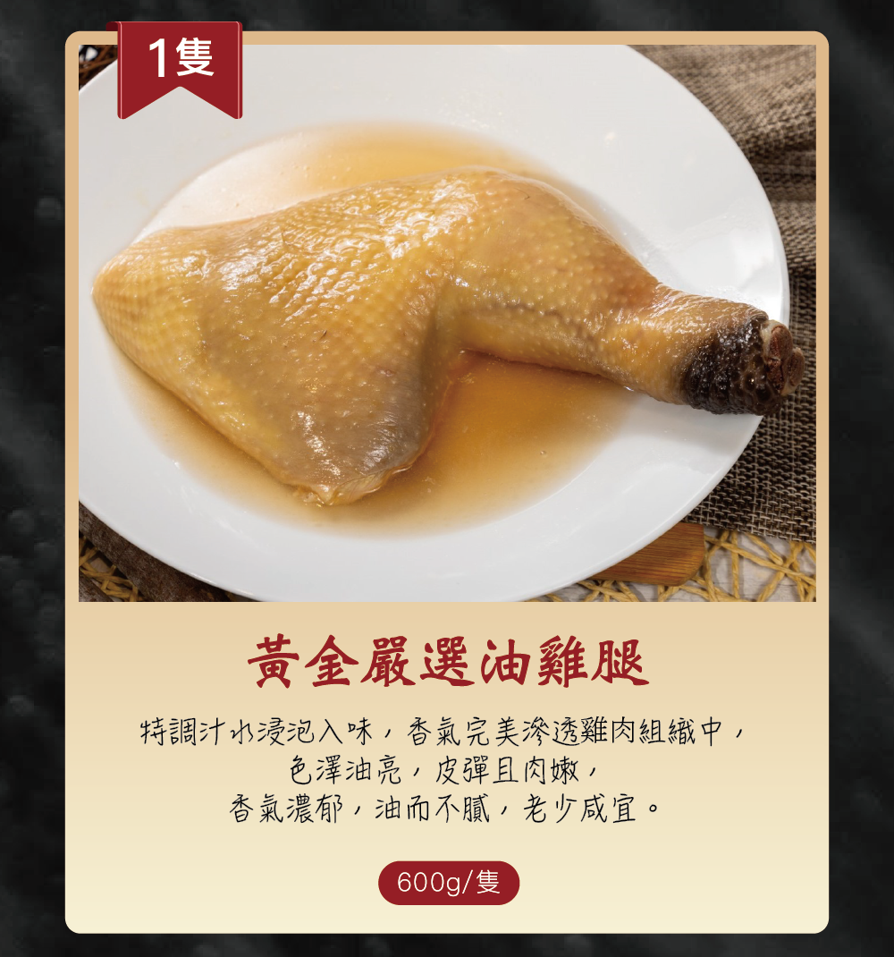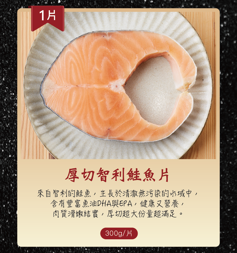 黃金嚴選油雞腿、 熟食蜜汁豬肋排、泰國鮮甜熟白蝦、熟凍帶殼海瓜子、馬來西亞彈牙大草蝦、厚切智利鮭魚片、日本JP北海道生食級干貝、金德老爹酸辣椒醬