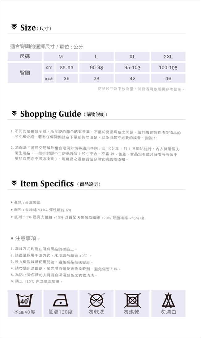底襯使用日本纖淨技術的永久性銀離子,具殺菌和除臭效果,對抗白色念珠菌、金黃色葡萄球菌等有害菌,保持私密處乾爽無異味。經SGS測試,殺菌除臭效果達99%以上。