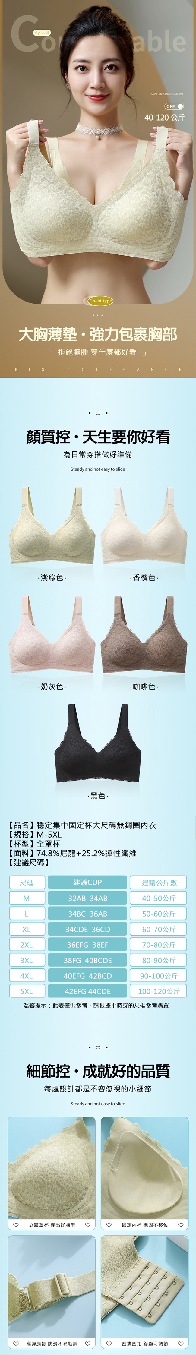 可機洗固定杯 大碼收副乳 輕薄防外擴 科技感軟支撐 防下滑 不勒身
