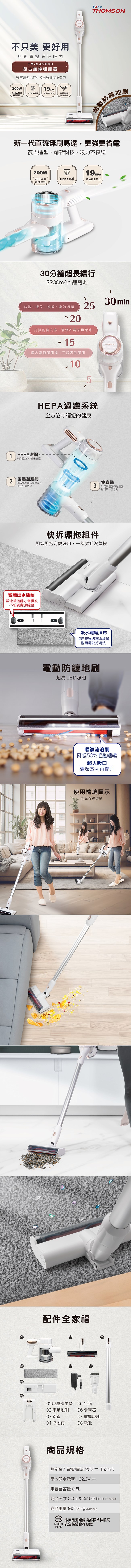 配件: 吸塵器主機、電動地刷、鋁管、拖地布、水箱、變壓器、寬扁吸刷、電池