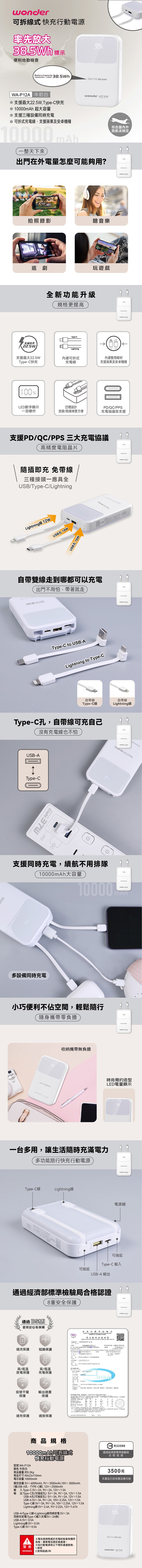 WONDER 可拆線式快充行動電源(10000mAh)白 WA-P12A