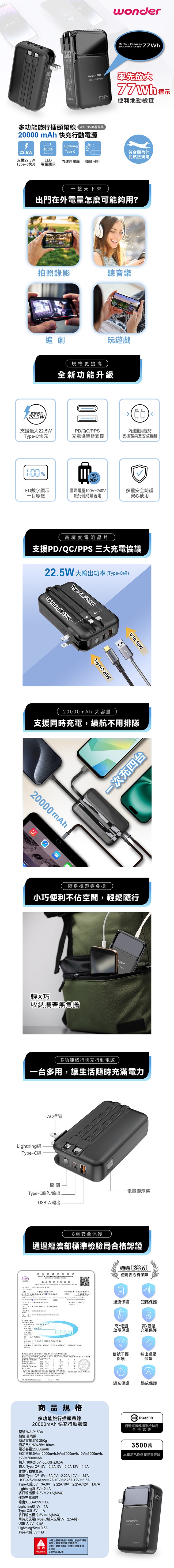 WONDER 多功能旅行插頭帶線快充行動電源20000mAh WA-P15BA