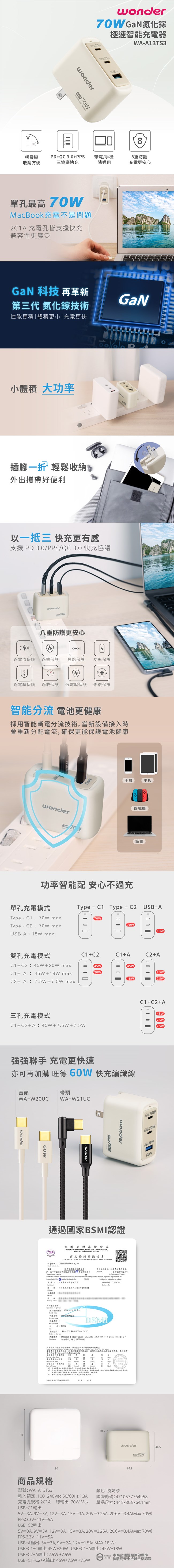WONDER 70W GaN氮化鎵極速智能充電器 WA-A13TS3