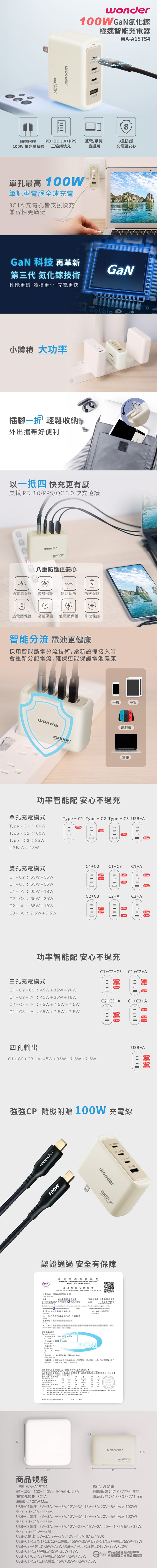 WONDER 100W GaN氮化鎵極速智能充電器 WA-A15TS4