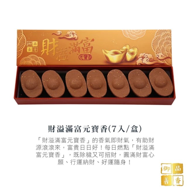 「財溢滿富元寶香」以多種珍貴香材如法製成,元寶造型象徵招財進寶,點燃一顆元寶香等同於二十柱香的功德;