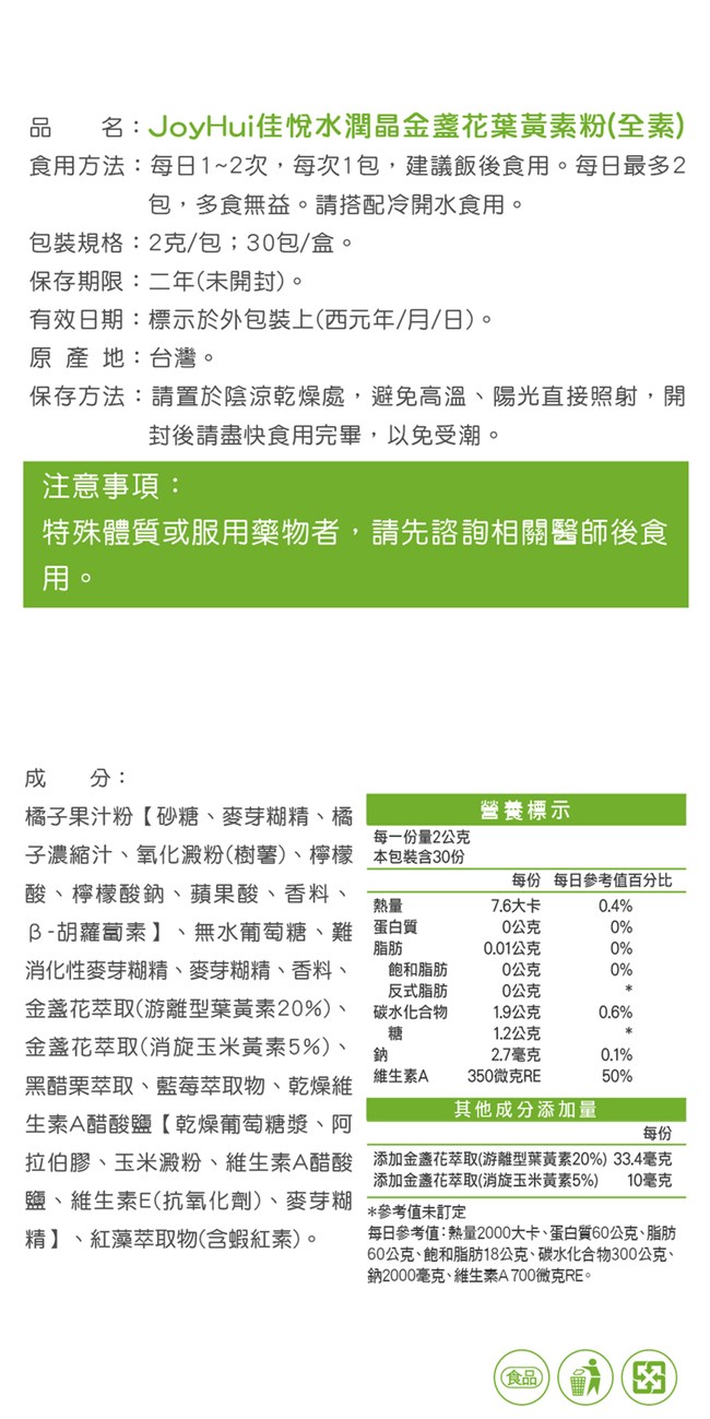JoyHui佳悅水潤晶金盞花葉黃素粉(全素) 成 分:橘子果汁粉【砂糖、麥芽糊精、橘子濃縮汁、氧化澱粉(樹薯)、檸檬酸、檸檬酸鈉、蘋果酸、香料、β-胡蘿蔔素】、無水葡萄糖、難消化性麥芽糊精、麥芽糊精、香料、金盞花萃取(游離型葉黃素20%)、金盞花萃取(消旋玉米黃素5%)、黑醋栗萃取、藍莓萃取物、乾燥維生素A醋酸鹽【乾燥葡萄糖漿、阿拉伯膠、玉米澱粉、維生素A醋酸鹽、維生素E(抗氧化劑)、麥芽糊精】、紅藻萃取物(含蝦紅素)。