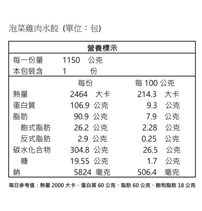 每一份量1150g 本包裝含1份 熱量 每份2464大卡、每100公克214.3大卡 蛋白質 每份106.9公克、每100公克9.3公克 脂肪 每份90.9公克、每100公克7.9公克 飽式脂肪 每份26.2公克、每100公克2.28公克 反式脂肪 每份2.9公克、每100公克0.25公克 碳水化合物 每份304.8公克、每100公克26.5公克 糖 每份19.55公克、每100公克1.7公克 鈉 每份5824毫克、每100公克506.4毫克