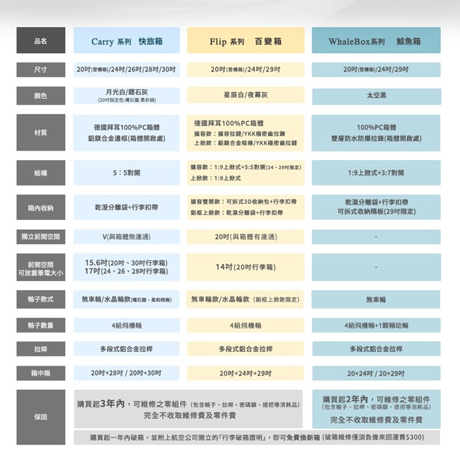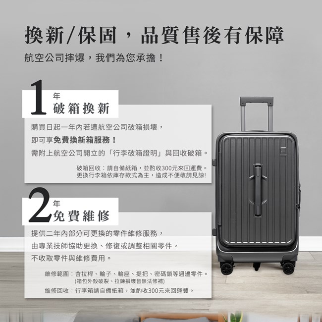 ・購買起一年內破箱,並附上航空公司開立的「行李破箱證明」,即可免費換新箱