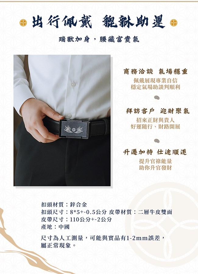 尺寸:(扣頭)8x5±0.5cm;(皮帶)110公分±2cm。