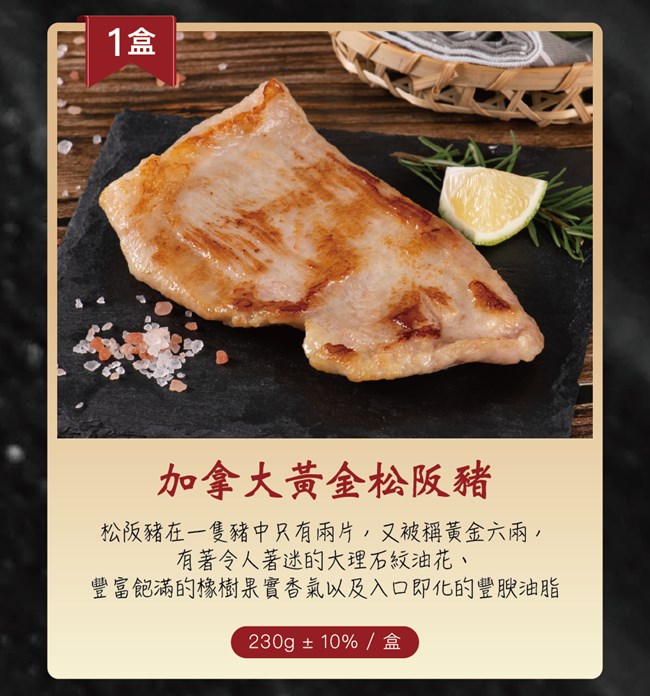 鯖魚170g(挪威) 黃金松阪豬230g±10%/盒(加拿大) 草蝦450g±10%,10隻/盒(馬來西亞) 板腱牛涮烤片200g±10%(美國) 無骨牛小排涮烤片150g±10%(美國) 豬五花200g±10%(台灣) 五花牛涮烤片200g±10%(美國)×2盒 豬梅花200g±10%(台灣) 翼板牛排150g±10%/包(美國)
