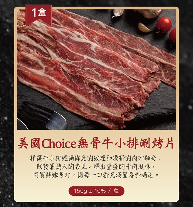 無骨牛小排涮烤肉片150g+10%/盒、板腱牛涮烤肉片 200g+10%/盒、五花牛涮肉片200g+10%/2 盒、翼板牛排 150g+10%x2包、台灣豬五花 200g+10%/包、台灣豬梅花 200g+10%/包、加拿大松阪豬 230g+10%/片、美國蒜味去骨雞腿排2片/500g/包、薄鹽鯖魚170g(淨重)/片、中美生白蝦650g(淨重)/盒