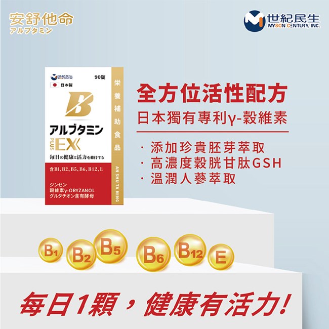 安舒他命EX plus融合了多種維他命B群、人蔘和穀胱甘肽等成分,