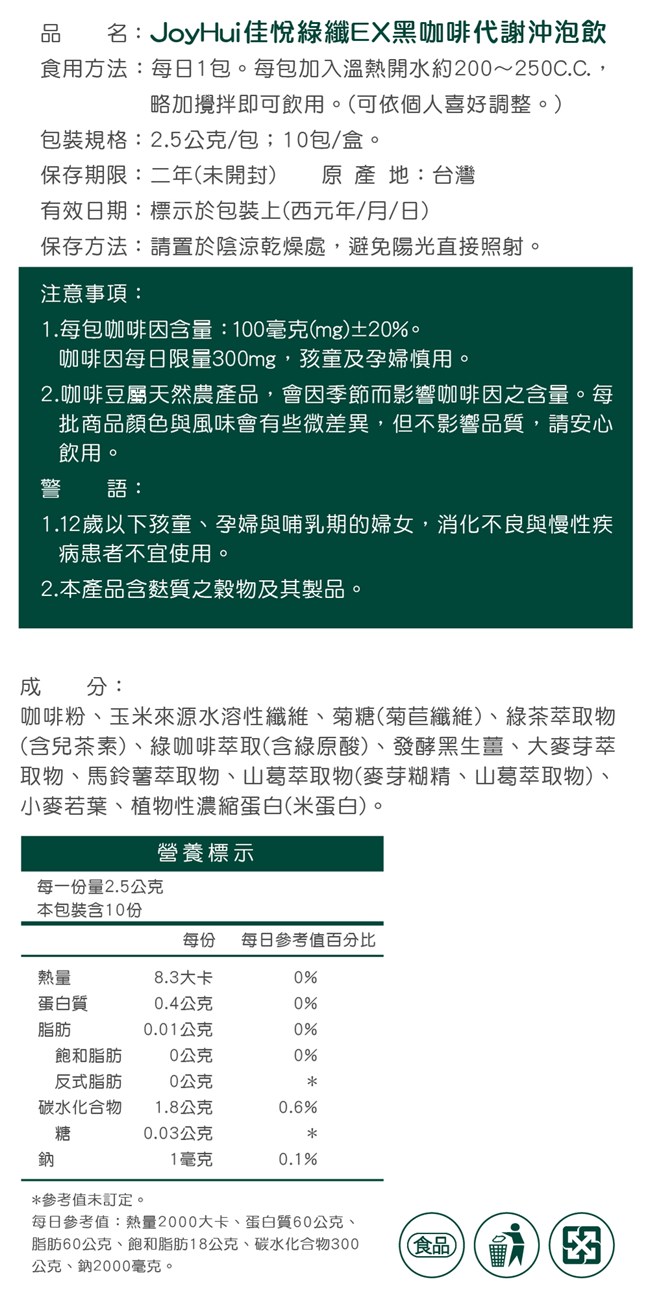 【JoyHui佳悅】綠纖EX代謝黑咖啡1盒(共10包、配方升級葛花+小麥若葉)