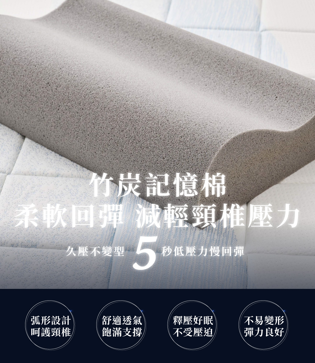 竹炭記憶棉、柔軟回彈、減輕頸椎壓力