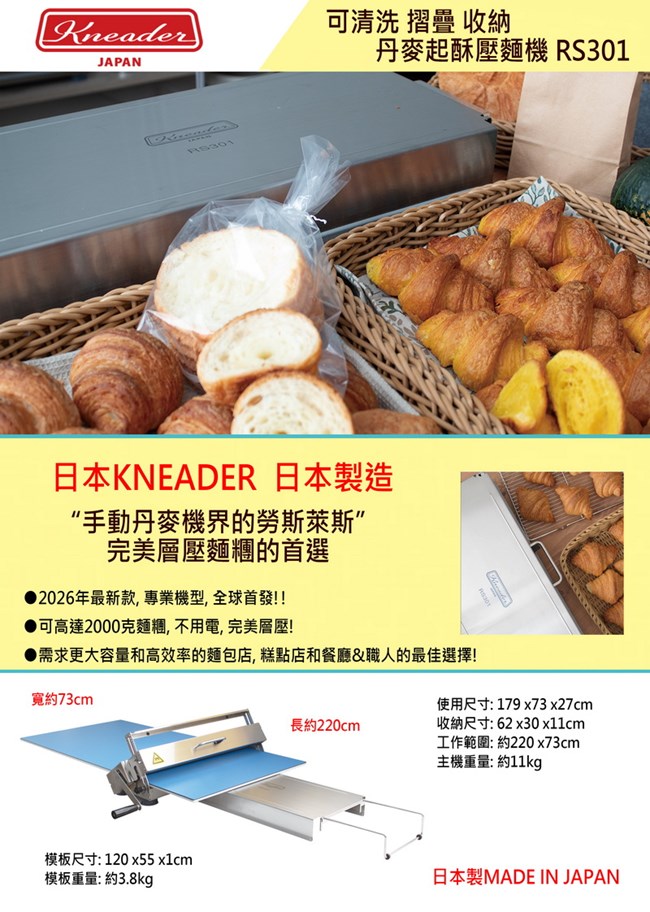日本製 KNEADER 可清洗摺疊收納丹麥起酥壓麵機 RS301