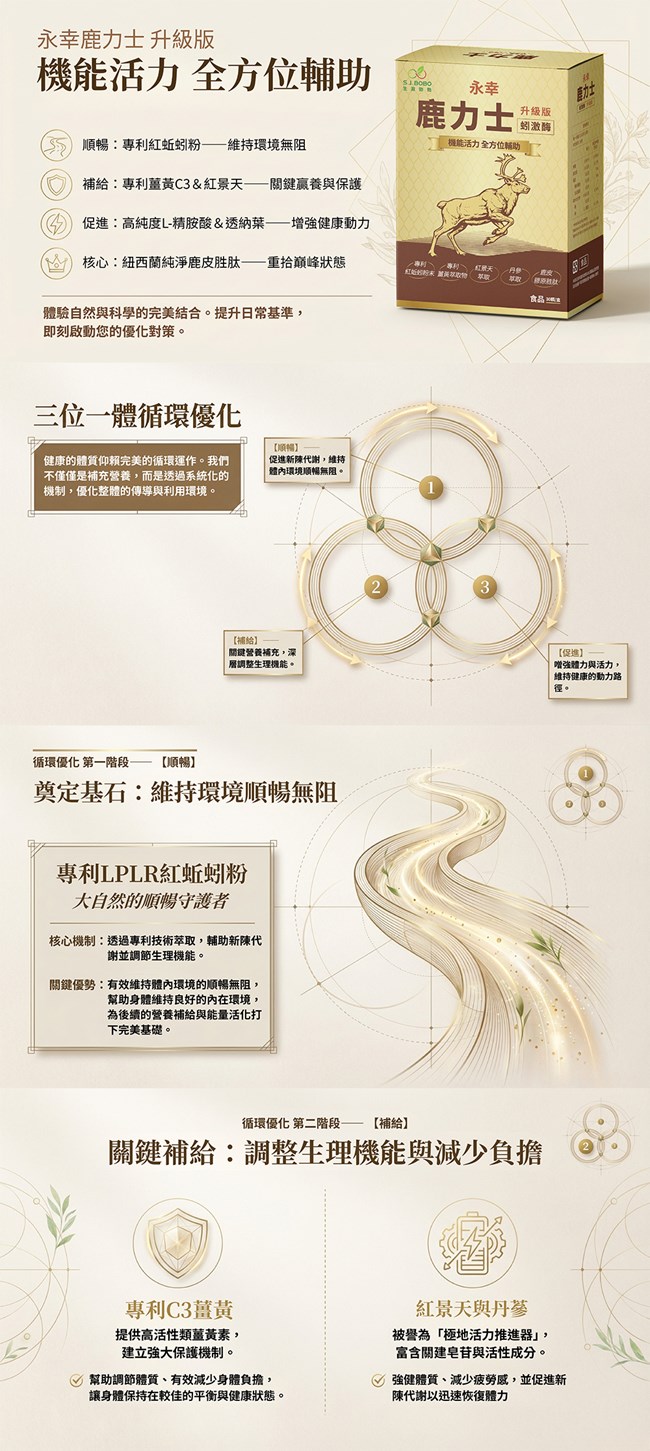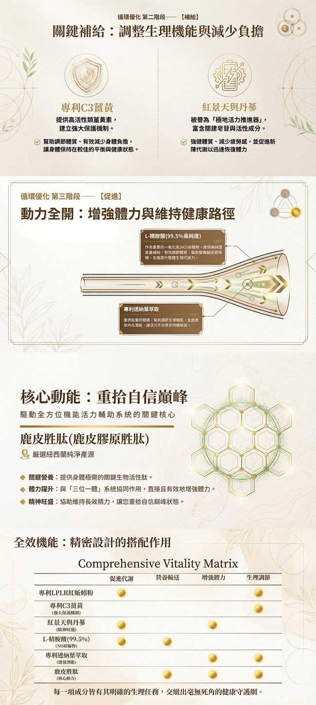 專利LPLR超級微脂體紅蚯蚓粉(含蚓激酶)、紅景天萃取物、丹蔘萃取物、專利C3薑黃萃取物、鹿皮膠原胜肽、透納葉萃取物、精氨酸