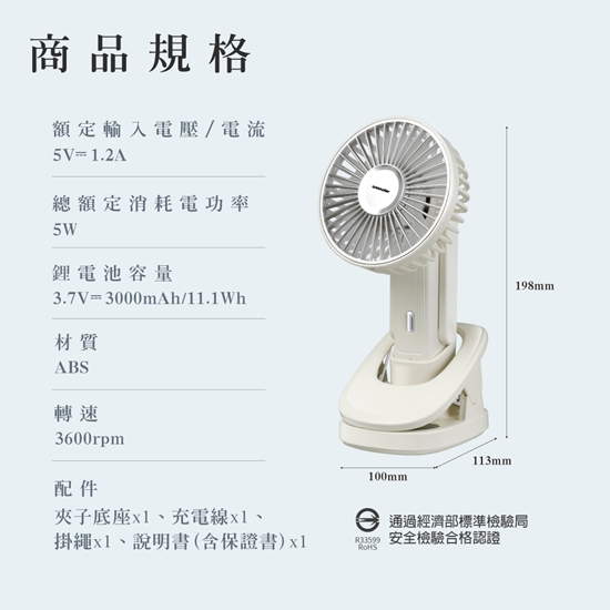 配件:夾子底座*1、掛繩*1,充電線*1,說明書(含保證書)*1