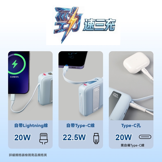 Type-C 5V⎓ 3A 充電時Type-C線+ Lightning線 同時充放電:5V⎓ 1A(max)